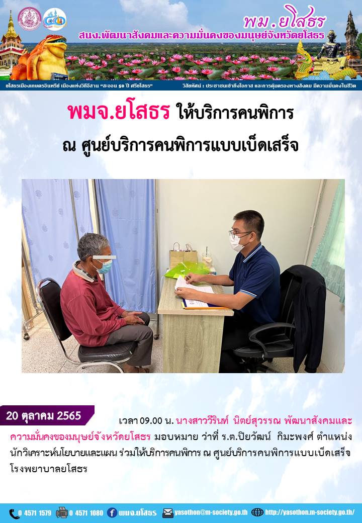 พมจ.ยโสธร ร่วมให้บริการคนพิการศูนย์บริการคนพิการแบบเบ็ดเสร็จโรงพยาบาลยโสธร (20 ตุลาคม 2565)