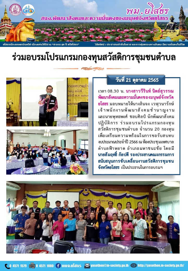 ร่วมอบรมโปรแกรมกองทุนสวัสดิการชุมชนตำบล จำนวน 20 กองทุน เพื่อเตรียมความพร้อมในการขอรับสบทบงบประมาณประจำปี 2566 (21 ตุลาคม 2565)