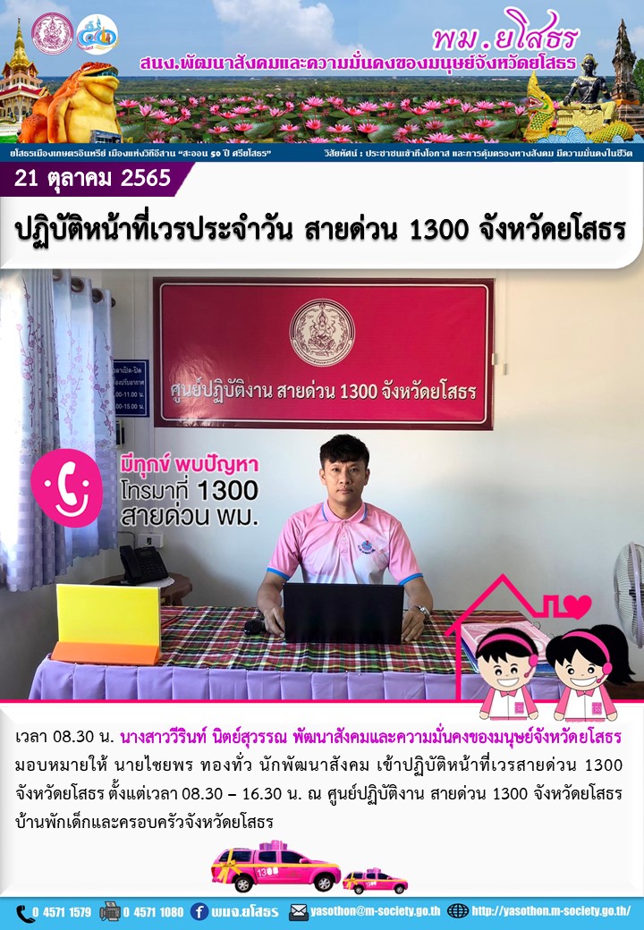 พมจ.ยโสธร เข้าปฏิบัติหน้าที่เวรสายด่วน 1300 จังหวัดยโสธร (21 ตุลาคม 2565)