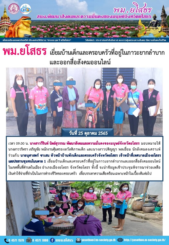 วันที่ 19 พ.ย. 2565 (21:30 น.)วันที่ 25 ตุลาคม 2565เวลา 09.00 น. นางสาววีรินท์ นิตย์สุวรรณ พัฒนาสังคมและความมั่นคงของมนุษย์จังหวัดยโสธร มอบหมายให้นางสาววริศรา เจริญชัย พนักงานคุ้มครองสวัสดิภาพเด็ก และนางสาวปติญญา พลเยี่ยม นักสังคมสงเคราะห์ ร่วมกับ นายนุศาสตร์ ซาเสน หัวหน้าบ้านพักเด็กและครอบครัวจังหวัดยโสธร เจ้าหน้าที่เทศบาลเมืองยโสธร และประธานชุมชนโนนตาล 1 เยี่ยมบ้านเด็กและครอบครัวที่อยู่ในภาวะยากลำบากและออกสื่อสังคมออนไลน์ ในเขตพื้นที่ตำบลในเมือง อำเภอเมืองยโสธร จังหวัดยโสธร ทั้งนี้ จะนำข้อมูลเข้าประชุมพิจารณาช่วยเหลือ เงินค่าใช้จ่ายที่จำเป็นในการดำรงชีวิตของครอบครัว เพื่อบรรเทาความเดือดร้อนเฉพาะหน้าในเบื้องต้นต่อไป
