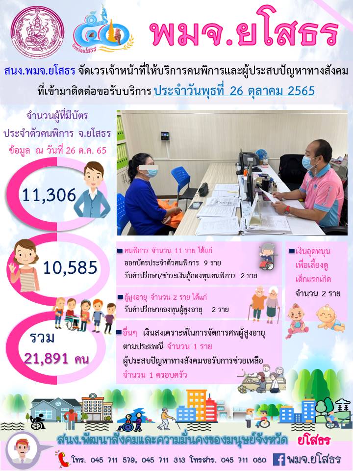 สนง.พมจ.ยโสธร จัดเวรเจ้าหน้าที่ให้บริการคนพิการและผู้ประสบปัญหาทางสังคม ที่เข้ามาติดต่อขอรับบริการ (26 ตุลาคม 2565)