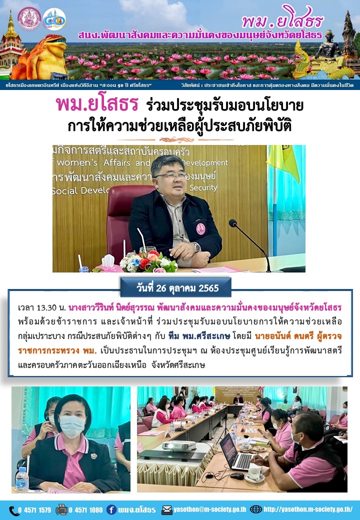 พมจ.ยโสธร ร่วมประชุมรับมอบนโยบายการให้ความช่วยเหลือผู้ประสบภัยพิบัติ (26 ตุลาคม 2565)