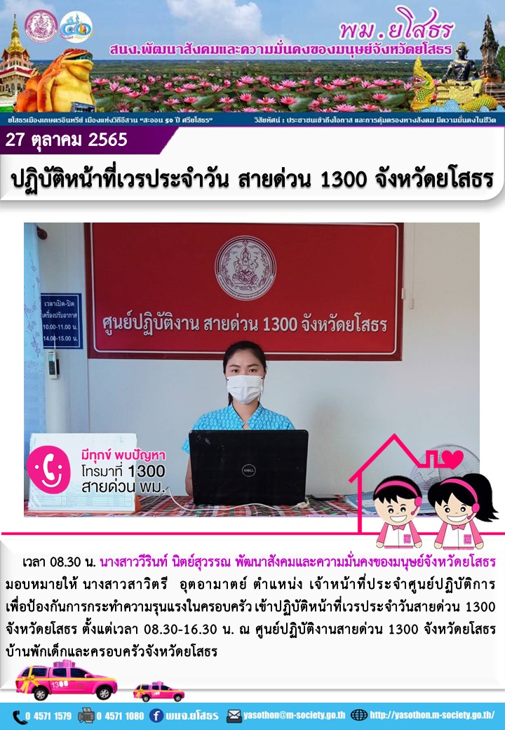 พมจ.ยโสธร เข้าปฏิบัติหน้าที่เวรประจำวันสายด่วน 1300 จังหวัดยโสธร (27 ตุลาคม 2565)