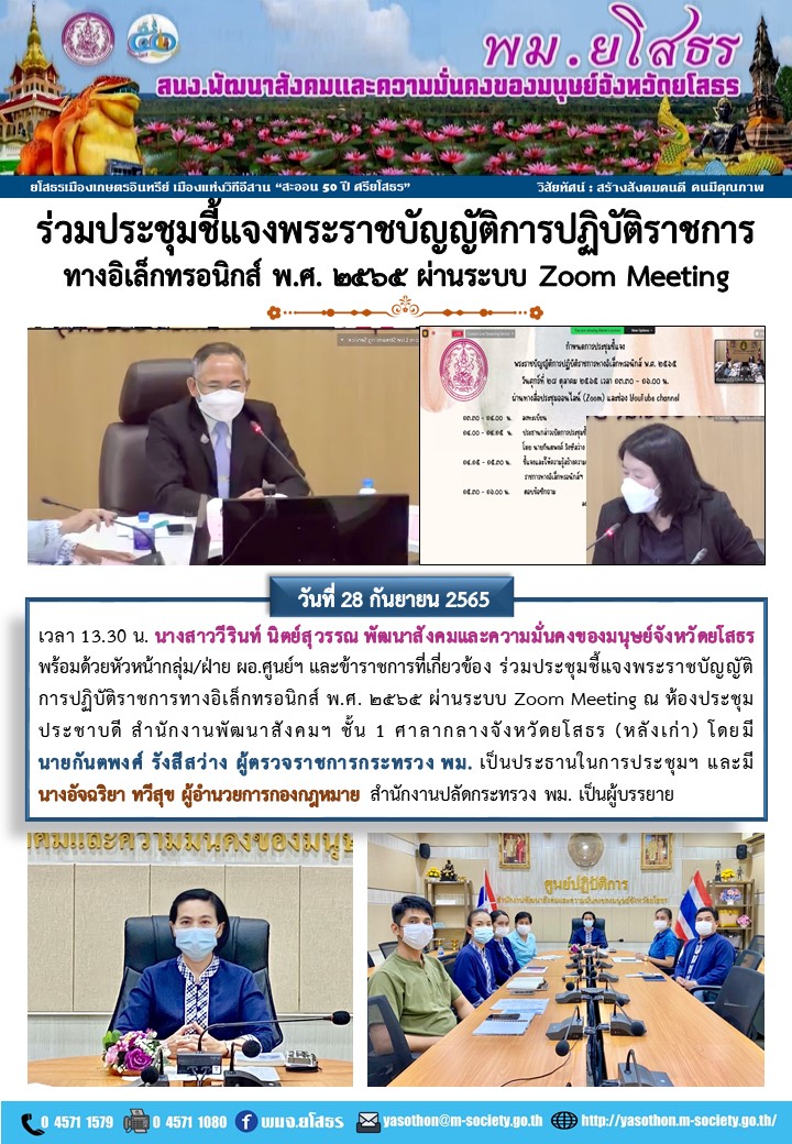 วันที่ 19 พ.ย. 2565 (23:08 น.)วันที่ 28 กันยายน 2565 เวลา 13.30 น. นางสาววีรินท์ นิตย์สุวรรณ พัฒนาสังคมและความมั่นคงของมนุษย์จังหวัดยโสธร พร้อมด้วยหัวหน้ากลุ่ม/ฝ่าย ผอ.ศูนย์ฯ และข้าราชการที่เกี่ยวข้อ ง ร่วมประชุมชี้แจงพระราชบัญญัติการปฏิบัติราชการทางอิเล็กทรอนิกส์ พ.ศ. ๒๕๖๕ ผ่านระบบ Zoom Meeting ณ ห้องประชุมประชาบดี สำนักงานพัฒนาสังคมฯ ชั้น 1 ศาลากลางจังหวัดยโสธร (หลังเก่า) โดยมีนายกันตพงส์ รังสีสว่าง ผู้ตรวจราชการกระทรวง พม. เป็นประธานในการประชุมฯ และมี นางอัจฉริยา ทวีสุข ผู้อำนวยการกองกฎหมาย สำนักงานปลัดกระทรวง พม. เป็นผู้บรรยาย