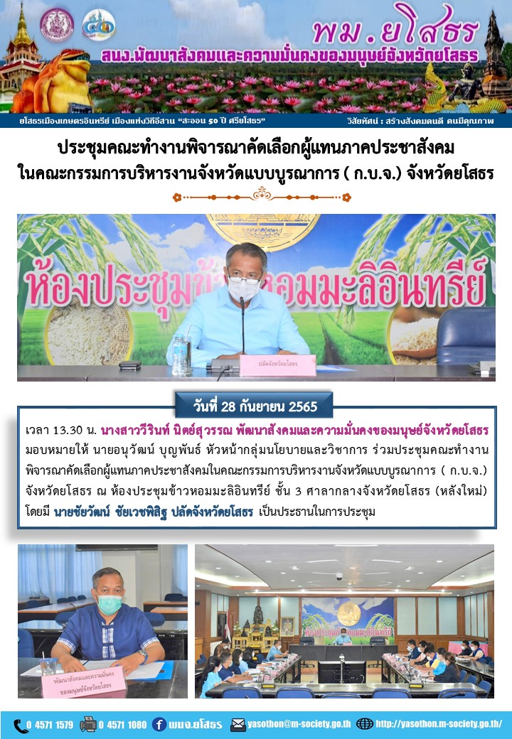 ร่วมประชุมคณะทำงานพิจารณาคัดเลือกผู้แทนภาคประชาสังคมในคณะกรรมการบริหารงานจังหวัดแบบบูรณาการ ( ก.บ.จ.) จังหวัดยโสธร (28 ตุลาคม 2565)