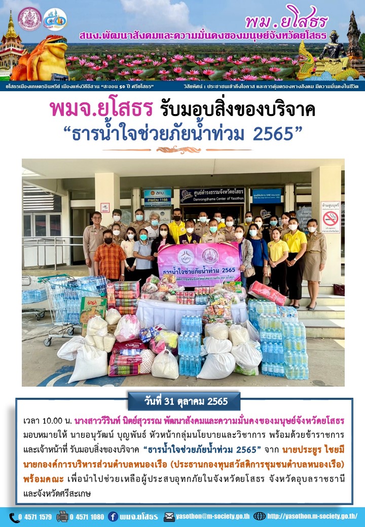 พมจ.ยโสธร รับมอบสิ่งของบริจาค "ธารน้ำใจช่วยภัยน้ำท่วม 2565" (31 ตุลาคม 2565)