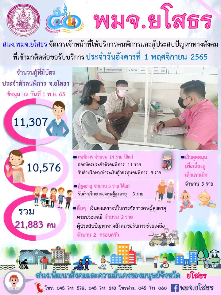 สนง.พมจ.ยโสธร จัดเวรเจ้าหน้าที่ให้บริการคนพิการและผู้ประสบปัญหาทางสังคม ที่เข้ามาติดต่อขอรับบริการ (1 พฤศจิกายน 2565)