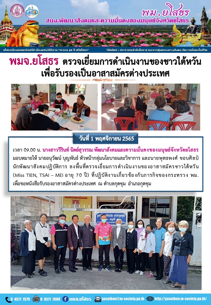 พมจ.ยโสธร ตรวจเยี่ยมการดำเนินงานของชาวใต้หวันเพื่อรับรองเป็นอาสาสมัครต่างประเทศ (1 พฤศจิกายน 2565)