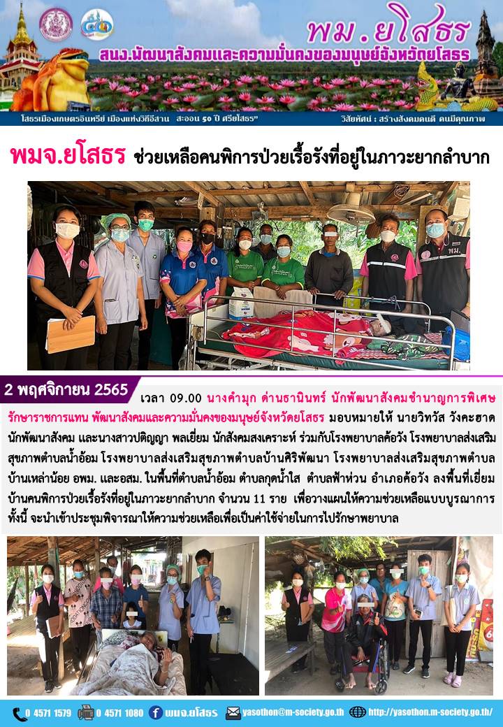 พมจ.ยโสธร ช่วยเหลือคนพิการป่วยเรื้อรังที่อยู่ในภาวะยากลำบาก (2 พฤศจิกายน 2565)