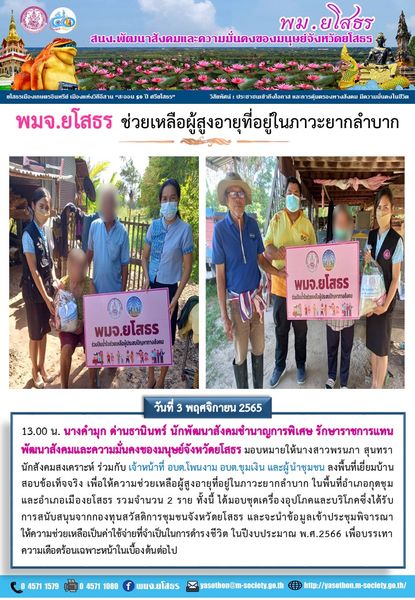 พมจ.ยโสธร ช่วยเหลือผู้สูงอายุที่อยู่ในภาวะยากลำบาก (3 พฤศจิกายน 2565)