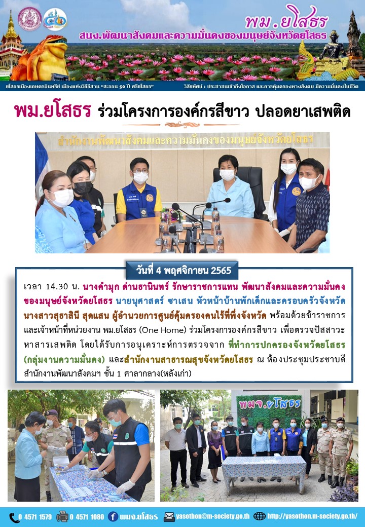 วันที่ 20 พ.ย. 2565 (00:00 น.)วันที่ 4 ตุลาคม 2565 เวลา 14.30 น. นางคำมุก ด่านธานินทร์ รักษาราชการแทน พัฒนาสังคมและความมั่นคงของมนุษย์จังหวัดยโสธร นายนุศาสตร์ ซาเสน หัวหน้าบ้านพักเด็กและครอบครัวจังหวัด นางสาวสุธาสินี สุดแสน ผู้อำนวยการศูนย์คุ้มครองคนไร้ที่พึ่งจังหวัด พร้อมด้วยข้าราชการและเจ้าหน้าที่หน่วยงาน พม.ยโสธร (One Home) ร่วมโครงการองค์กรสีขาว เพื่อตรวจปัสสาวะหาสารเสพติด โดยได้รับการอนุเคราะห์การตรวจจาก ที่ทำการปกครองจังหวัดยโสธร (กลุ่มงานความมั่นคง) และสำนักงานสาธารณสุขจังหวัดยโสธร ณ ห้องประชุมประชาบดี สำนักงานพัฒนาสังคมฯ ชั้น 1 ศาลากลาง(หลังเก่า)
