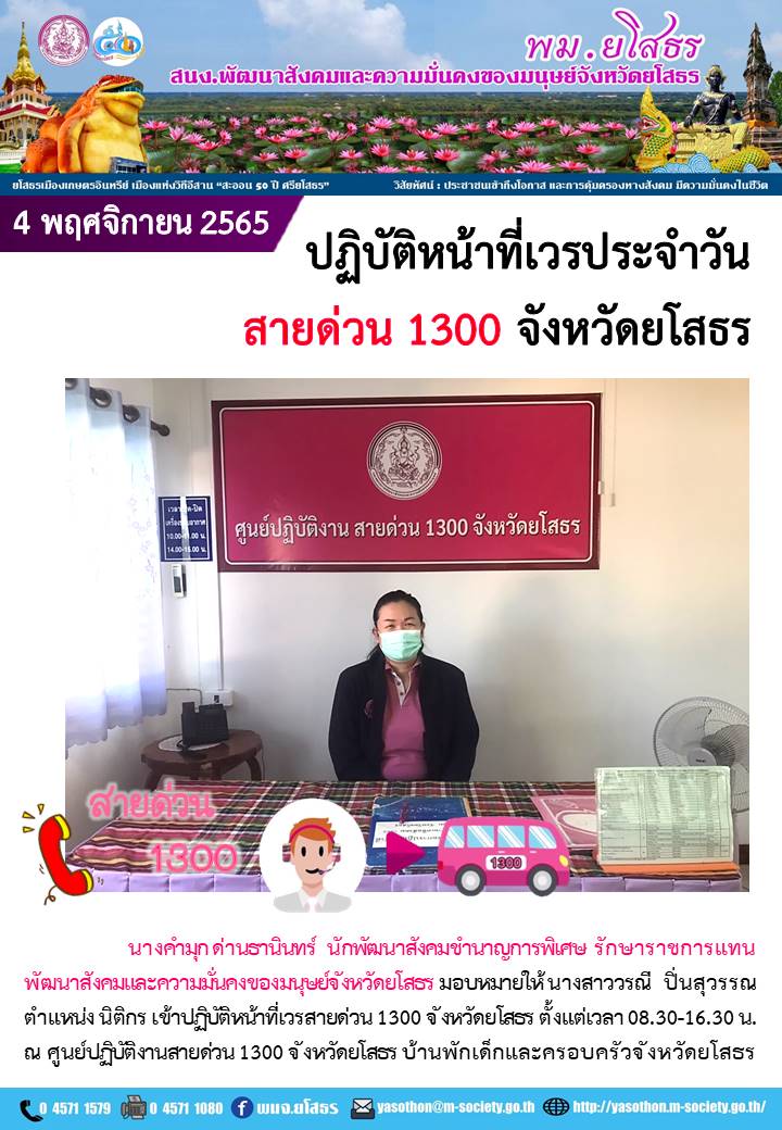 พมจ.ยโสธร เข้าปภูบัติหน้าที่เวรสายด่วน 1300 จังหวัดยโสธร (4 พฤศจิกายน 2565)