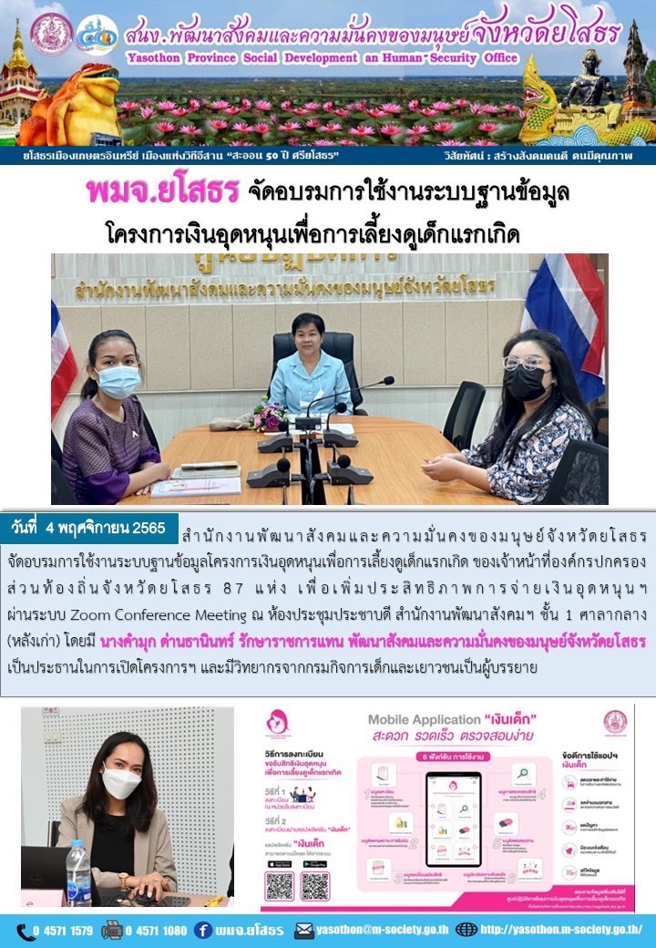 วันที่ 20 พ.ย. 2565 (00:14 น.)วันที่ 4 พฤศจิกายน 2565 สำนักงานพัฒนาสังคมและความมั่นคงของมนุษย์จังหวัดยโสธร จัดอบรมการใช้งานระบบฐานข้อมูลโครงการเงินอุดหนุนเพื่อการเลี้ยงดูเด็กแรกเกิด ของเจ้าหน้าที่องค์กรปกครองส่วนท้องถิ่นจังหวัดยโสธร 87 แห่ง เพื่อเพิ่มประสิทธิภาพการจ่ายเงินอุดหนุนฯ ผ่านระบบZoom Conference Meeting ณ ห้องประชุมประชาบดี สำนักงานพัฒนาสังคมฯ ชั้น 1 ศาลากลาง (หลังเก่า) โดยมี นางคำมุก ด่านธานินทรั รักษาราชการแทน พัฒนาสังคมและความมั่นคงของมนุษย์จังหวัดยโสธร เป็นประธานในการเปิดโครงการฯ และมีวิทยากรจากกรมกิจการเด็กและเยาวชนเป็นผู้บรรยาย