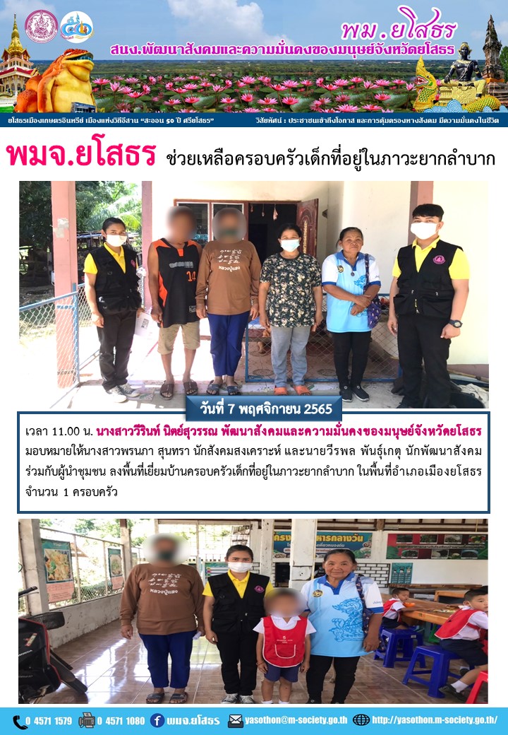 พมจ.ยโสธร ช่วยเหลือครอบครัวเด็กที่อยู่ในภาวะยากลำบาก (7 พฤศจิกายน 2565)