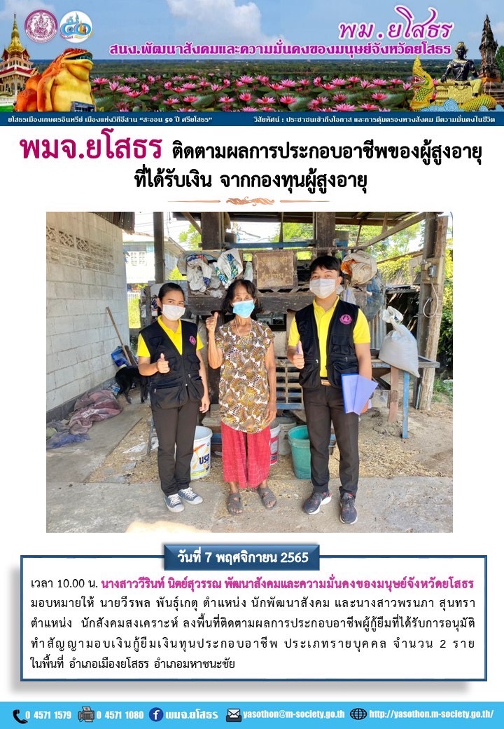 พมจ.ยโสธร ติดตามผลการประกอบอาชีพของผู้สูงอายุที่ได้รับเงิน จากกองทุนผู้สูงอายุ (7 พฤศจิกายน 2565)