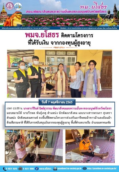 วันที่ 20 พ.ย. 2565 (00:38 น.)วันที่ 7 พฤศจิกายน 2565 เวลา 15.00 น. นางสาววีรินท์ นิตย์สุวรรณ พัฒนาสังคมและความมั่นคงของมนุษย์จังหวัดยโสธร มอบหมายให้ นายวีรพล พันธุ์เกตุ ตำแหน่ง นักพัฒนาสังคม และนางสาวพรนภา สุนทรา ตำแหน่ง นักสังคมสงเคราะห์ ลงพื้นที่ติดตามโครงการส่งเสริมอาชีพทอผ้าขาวม้าและย้อมผ้าด้วยสีธรรมชาติ ที่ได้รับการสนับสนุนเงินจากกองทุนผู้สูงอายุ พื้นที่ตำบลบากเรือ อำเภอมหาชนะชัย