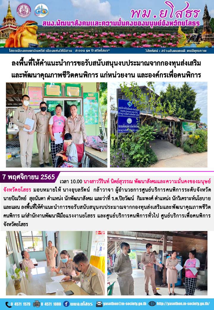 วันที่ 20 พ.ย. 2565 (00:44 น.)วันที่ 7 พฤศจิกายน 2565 เวลา 10.00 น. นางสาววีรินท์ นิตย์สุวรรณ พัฒนาสังคมและความมั่นคงของมนุษย์จังหวัดยโสธร มอบหมายให้ นางอุบลรัตน์ กล้าวาจา ผู้อำนวยการศูนย์บริการคนพิการระดับจังหวัด นายปัณวิทย์ สุอนันตา ตำแหน่ง นักพัฒนาสังคม และว่าที่ ร.ต.ปิยวัฒน์ กิมะพงศ์ ตำแหน่ง นักวิเคราะห์นโยบายและแผน ลงฟื้นที่ให้คำแนะนำการขอรับสนับสนุนงบประมาณจากกองทุนส่งเสริมและพัฒนาคุณภาพชีวิตคนพิการ แก่สำนักงานพัฒนาฝีมือแรงงานยโสธร และศูนย์บริการคนพิการทั่วไป ศูนย์บริการเพื่อคนพิการจังหวัดยโสธร
