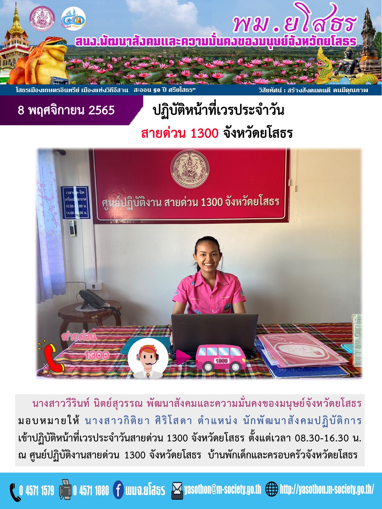 พมจ.ยโสธร เข้าปฏิบัติหน้าที่เวรประจำวันสายด่วน 1300 จังหวัดยโสธร (8 พฤศจิกายน 2565)