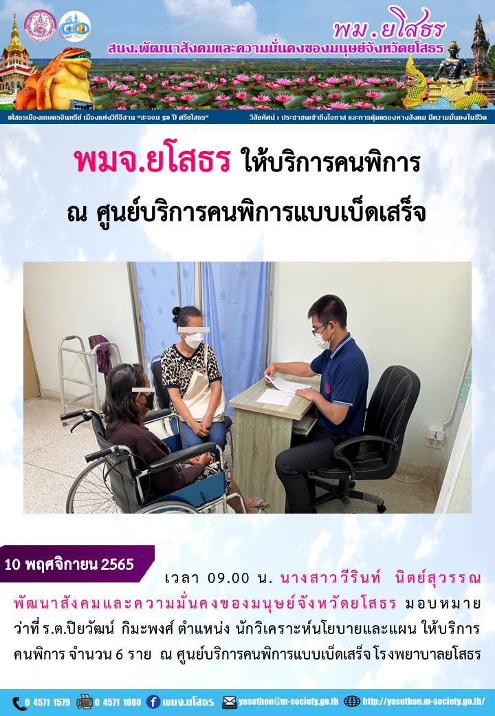 พมจ.ยโสธร ให้บริการคนพิการ ณ ศูนย์บริการคนพิการแบบเบ็ดเสร็จ โรงพยาบาลยโสธร (10 พฤศจิกายน 2565)