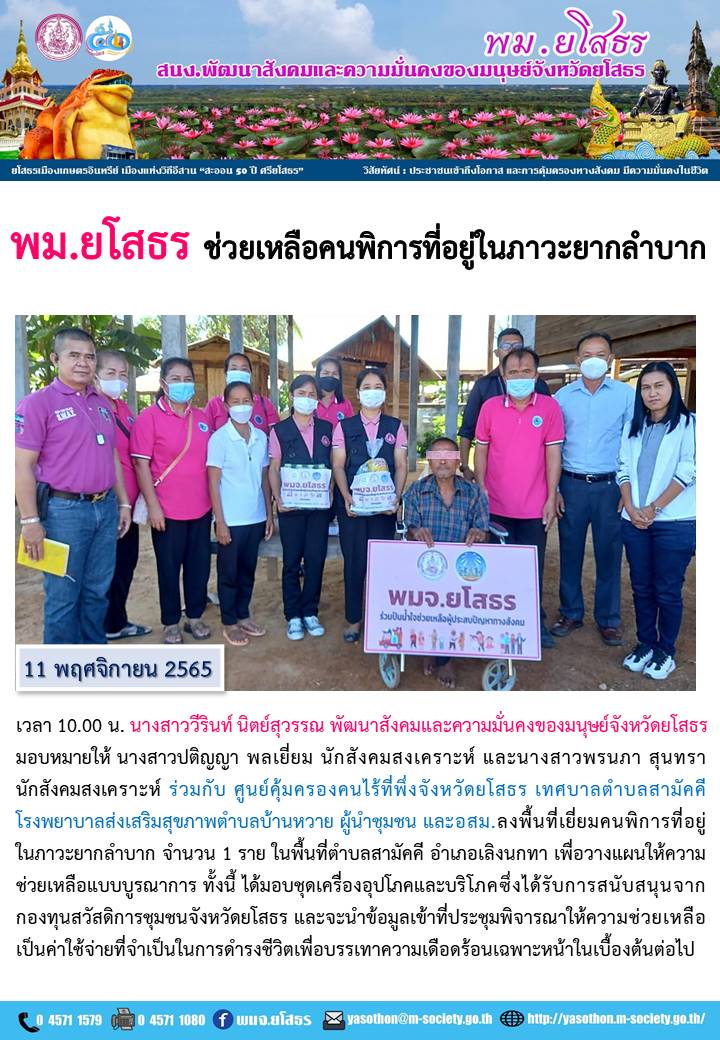 พม.ยโสธร ช่วยเหลือคนพิการที่อยู่ในภาวะยากลำบาก (11 พฤศจิกายน 2565)