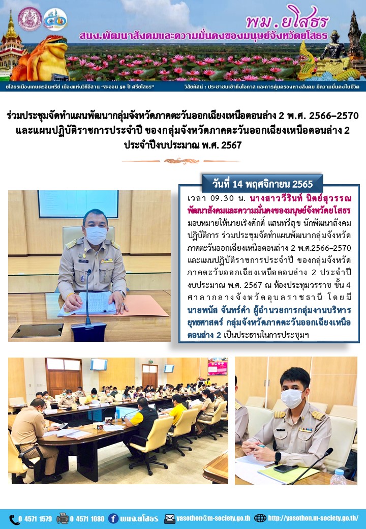 ร่วมประชุมจัดทำแผนพั่ฒนากลุ่มจังหวัด ภาคตะวันออกเฉียงเหนือตอนล่าง 2 พ.ศ.2566-2570 และแผนปฏิบัติราชการประจำปี ของกลุ่มจังหวัด ภาคตะวันออกเฉียงเหนือตอนล่าง 2 ประจำปีงบประมาณ พ.ศ. 2567 (14 พฤศจิกายน 2565)