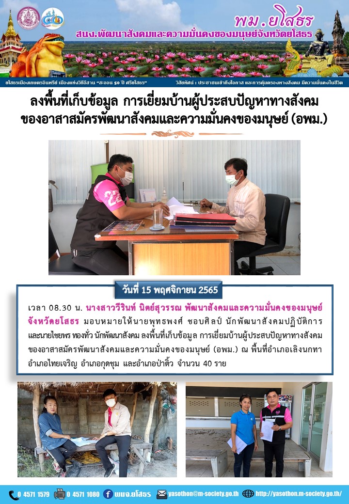 วันที่ 25 พ.ย. 2565 (09:09 น.)วันที่ 15 พฤศจิกายน 2565 เวลา 08.30 น. นางสาววีรินท์ นิตย์สุวรรณ พัฒนาสังคมและความมั่นคงของมนุษย์จังหวัดยโสธร มอบหมายให้นายพุทธพงศ์ ชอบศิลป์ นักพัฒนาสังคมปฏิบัติการ และนายไชยพร ทองทั่ว นักพัฒนาสังคม ลงพื้นที่เก็บข้อมูล การเยี่ยมบ้านผู้ประสบปัญหาทางสังคมของอาสาสมัครพัฒนาสังคมและความมั่นคงของมนุษย์ (อพม. ณ พื้นที่อำเภอเลิงนกทา อำเภอไทยเจริญ อำเภอกุดชุม และอำเภอป่าติ้ว จำนวน 40 ราย