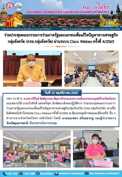 วันที่ 25 พ.ย. 2565 (10:00 น.)วันที่ 15 พฤศจิกายน 2565 เวลา 13.30 น. นางสาววีรินท์ นิตย์สุวรรณ พัฒนาสังคมและความมั่นคงของมนุษย์จังหวัดยโสธร มอบหมายให้ นายเริงศักดิ์ แสนทวีสุข นักพัฒนาสังคมปฏิบัติการ ร่วมประชุมคณะกรรมการร่วมภาครัฐและเอกชนเพื่อแก้ไขปัญหาทางเศรษฐกิจกลุ่มจังหวัด (กรอ.กลุ่มจังหวัด) ผ่านสื่ออิเล็กทรอนิกส์ (โปรแกรม Cisco Webex) ครั้งที่ 4/2565 ณ ห้องประชุมข้าวหอมมะลิอินทรีย์ ชั้น 3 ศาลากลางจังหวัดยโสธร (หลังใหม่ โดยมี นายสมเพชร สร้อยสระดู รองผู้ว่าราชการจังหวัดอุบลราชธานี เป็นประธานในการประชุม