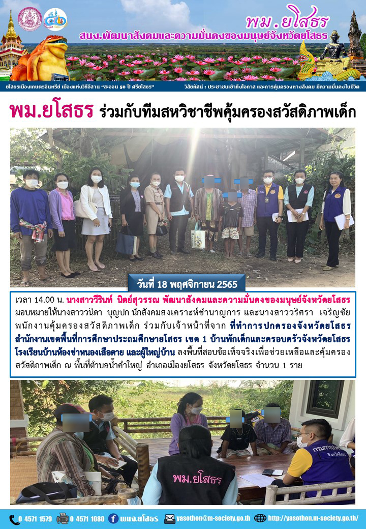 วันที่ 28 พ.ย. 2565 (11:47 น.)วันที่ 18 พฤศจิกายน 2565 เวลา 14.00 น. นางสาววีรินท์ นิตย์สุวรรณ พัฒนาสังคมและความมั่นคงของมนุษย์จังหวัดยโสธร มอบหมายให้นางสาววนิดา บุญปก นักสังคมสงเคราะห์ชำนาญการ และนางสาววริศรา เจริญชัย พนักงานคุ้มครองสวัสดิภาพเด็ก ร่วมกับเจ้าหน้าที่จาก ที่ทำการปกครองจังหวัดยโสธร สำนักงานเขตพื้นที่การศึกษาประถมศึกษายโสธร เขต 1 บ้านพักเด็กและครอบครัวจังหวัดยโสธร โรงเรียนบ้านห้องข่าหนองเสือตาย และผู้ใหญ่บ้าน ลงพื้นที่สอบข้อเท็จจริงเพื่อช่วยเหลือและคุ้มครองสวัสดิภาพเด็ก ณ พื้นที่ตำบลน้ำคำใหญ่ อำเภอเมืองยโสธร จังหวัดยโสธร จำนวน 1 ราย