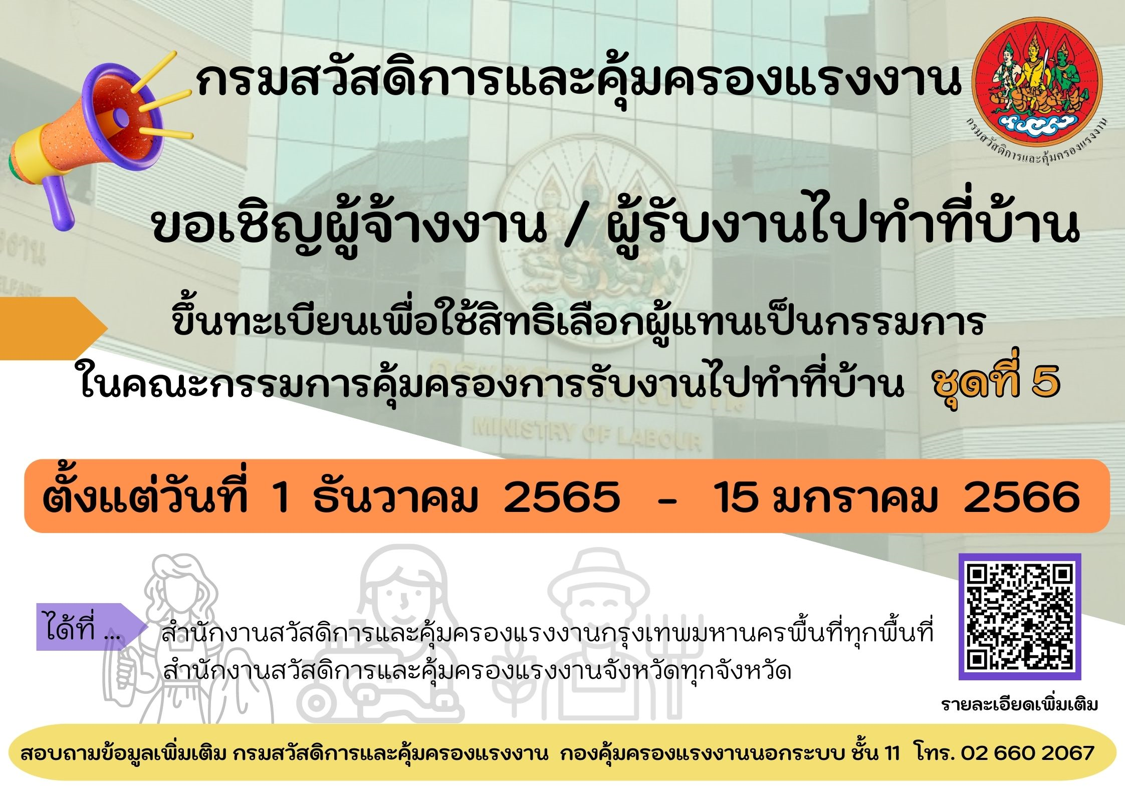 วันที่ 6 ธ.ค. 2565 (15:57 น.)ขอเชิญผู้จ้างงาน/ผู้รับงานไปทำที่บ้าน ขึ้นทะเบียนเพื่อใช้สิทธิเลือกผู้แทนเป็นกรรมการในคณะกรรมการคุ้มครองการรับงานไปทำที่บ้าน