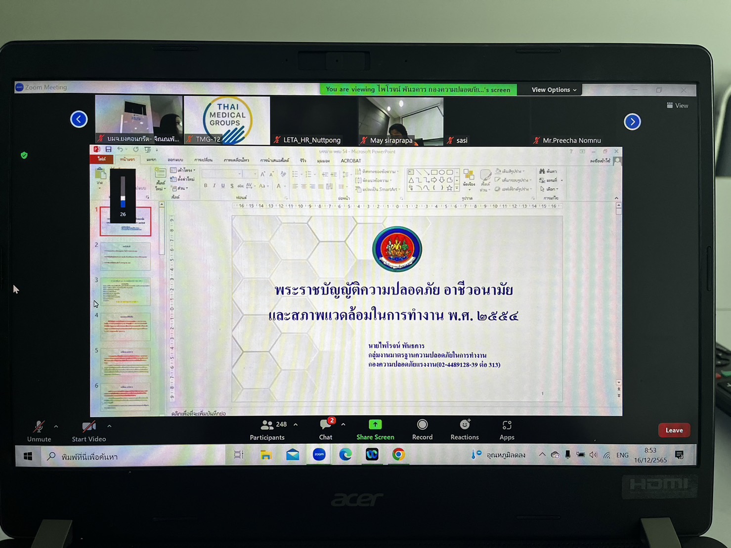 วันที่ 16 ธ.ค. 2565 (11:42 น.)วันศุกร์ที่ 16 ธันวาคม 2565 เวลา 09.00 น. นางสาวสุจิตตรา เยาวราช นักวิชาการแรงงานชำนาญการ รักษาราชการแทนสวัสดิการและคุ้มครองแรงงานจังหวัดยโสธร มอบหมายให้เจ้าหน้าที่สำนักงานฯ เข้าร่วมรับฟังการอบรมหลักสูตร กฎหมายแรงงานที่นายจ้าง ลูกจ้างต้องรู้ รุ่นที่ 1 จัดอบรมในรูปแบบออนไลน์ผ่านระบบ Conference ในหัวข้อบรรยาย พระราชบัญญัติความปลอดภัย อาชีวอนามัยและสภาพแวดล้อมในการทำงาน พ.ศ.2554 โดย นายไพโรจน์ พันธคาร ผู้อำนวยการกลุ่มงานมาตรฐานความปลอดภัยในการทำงาน กองความปลอดภัยแรงงาน ณ ห้องฝึกอบรมทรัพยากรแรงงาน ชั้น 13 สำนักงานพัฒนามาตรฐานแรงงาน กรมสวัสดิการและคุ้มครองแรงงาน
