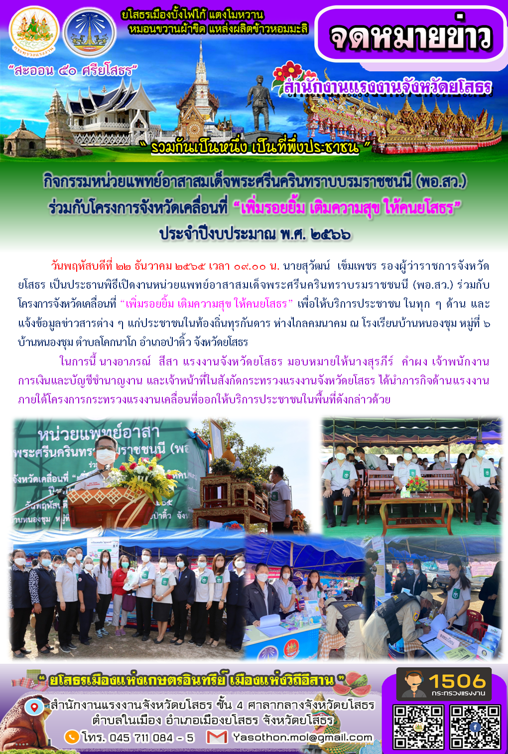 สรจ.ยโสธร เข้าร่วมกิจกรรมหน่วยแพทย์อาสาสมเด็จพระศรีนครินทราบบรมราชชนนี (พอ.สว.) ร่วมกับโครงการจังหวัดเคลื่อนที่ “เพิ่มรอยยิ้ม เติมความสุข ให้คนยโสธร” ประจำปีงบประมาณ พ.ศ. 2566