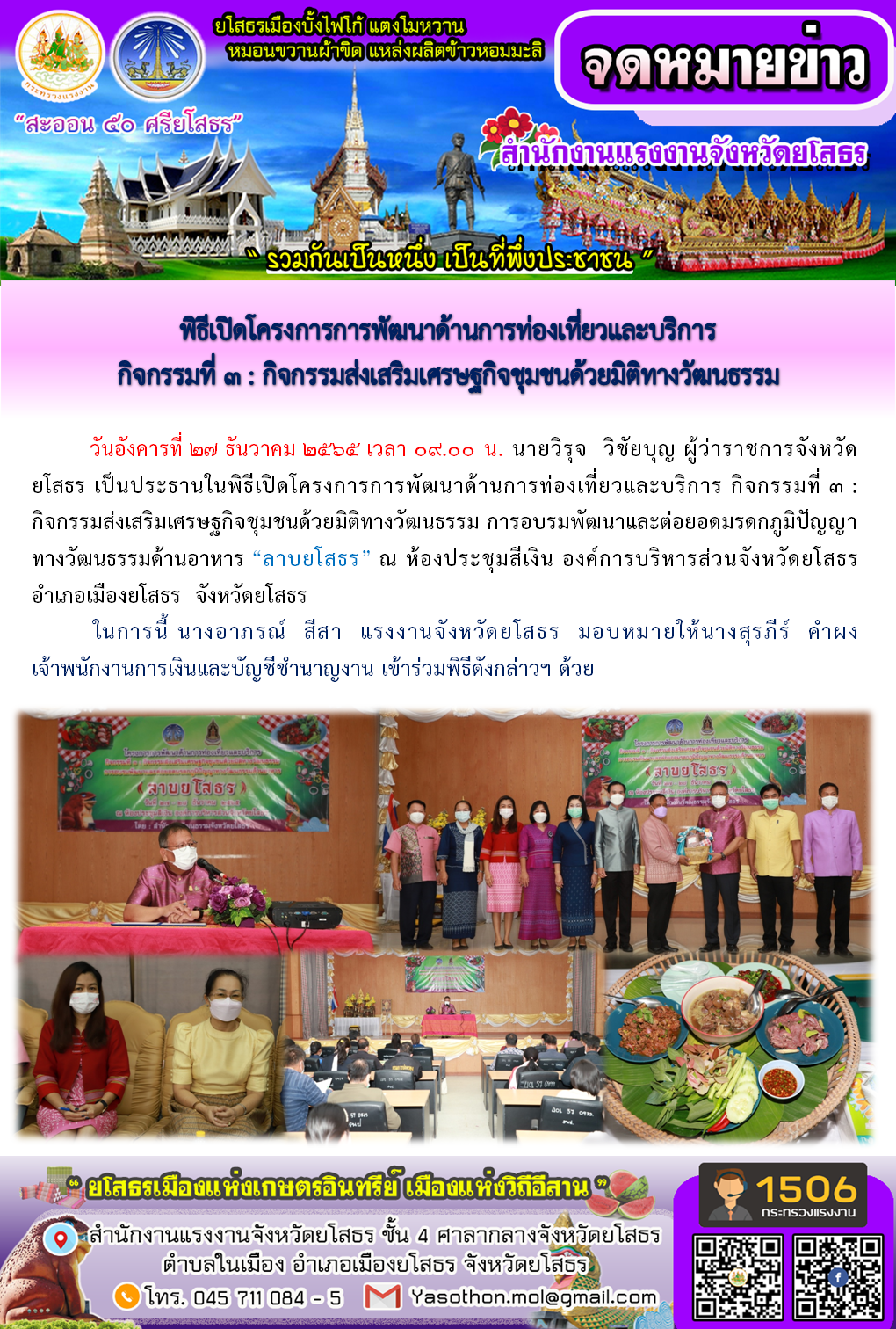 สรจ.ยโสธร เข้าร่วมพิธีเปิดโครงการการพัฒนาด้านการท่องเที่ยวและบริการ กิจกรรมที่ 3 : กิจกรรมส่งเสริมเศรษฐกิจชุมชนด้วยมิติทางวัฒนธรรม