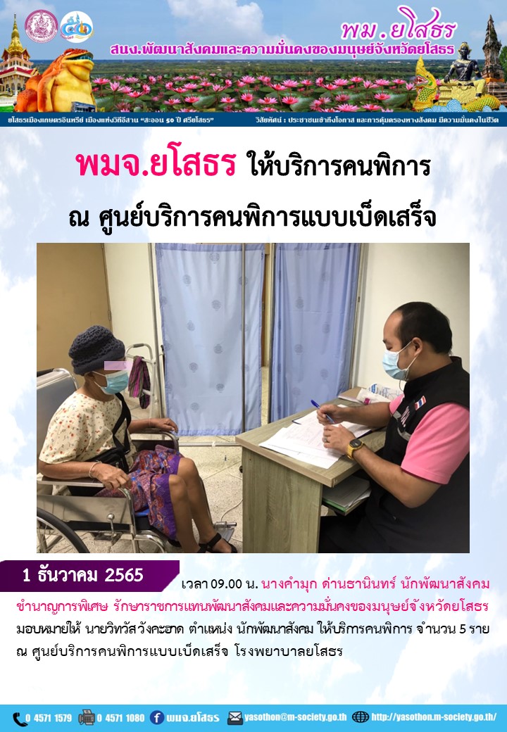 ให้บริการคนพิการ จำนวน 5 ราย ณ ศูนย์บริการคนพิการแบบเบ็ดเสร็จ โรงพยาบาลยโสธร (1 ธันวาคม 2565)