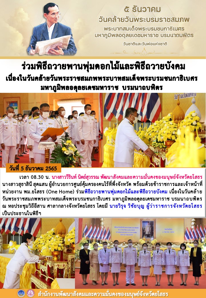 วันที่ 3 ม.ค. 2566 (11:28 น.)วันที่ 5 ธันวาคม 2565 เวลา 08.30 น. นางสาววีรินท์ นิตย์สุวรรณ พัฒนาสังคมและความมั่นคงของมนุษย์จังหวัดยโสธร นางสาวสุธาสินี สุดแสน ผู้อำนวยการศูนย์คุ้มครองคนไร้ที่พึ่งจังหวัด พร้อมด้วยข้าราชการและเจ้าหน้าที่ หน่วยงาน พม.ยโสธร (One.Home) ร่วมพิธีถวายพานพุ่มดอกไม้และพิธีถวายบังคม เนื่องในวันคล้าย วันพระราชสมภพพระบาทสมเด็จพระบรมชนกาธิเบศร มหาภูมิพลอดุลยเดชมหาราช บรมนาถบพิตร ณ หอประชุมวิถีอีสาน ศาลากลางจังหวัดยโสธร โดยมี นายวิรุจ วิชัยบุญ ผู้ว่าราชการจังหวัดยโสธร เป็นประธานในพิธีฯ