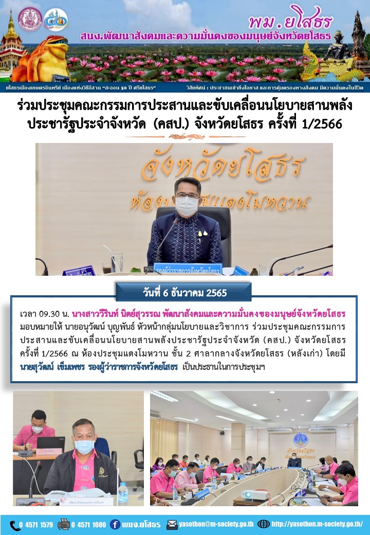 ร่วมประชุมคณะกรรมการประสานและขับเคลื่อนนโยบายสานพลังประชารัฐประจำจังหวัด (คสป.) จังหวัดยโสธร ครั้งที่ 1/2566 ( 6ธันวาคม 2565)