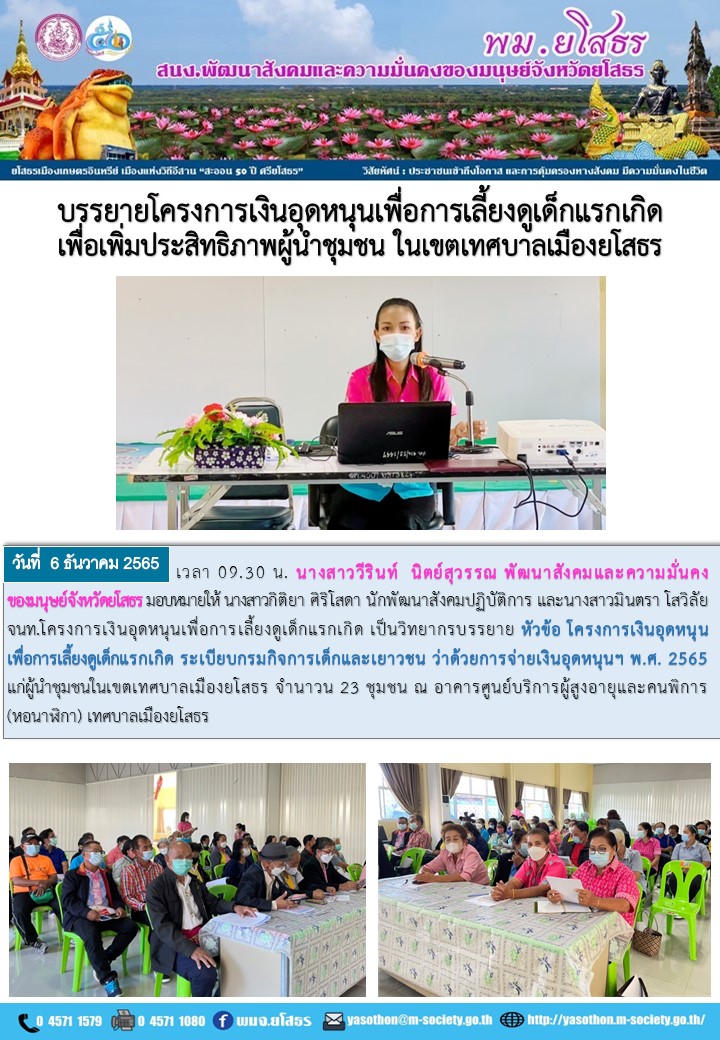 วันที่ 3 ม.ค. 2566 (11:41 น.)วันที่ 6 ธันวาคม 2565 เวลา 09.30 น. นางสาววีรินท์ นิตย์สุวรรณ พัฒนาสังคมและความมั่นคงของมนุษย์จังหวัดยโสธร มอบหมายให้ นางสาวกิติยา ศิริโสดา นักพัฒนาสังคมปฏิบัติการ และนางสาวมินตรา โสวิสั จนท.โครงการเงินอุดหนุนเพื่อการเลี้ยงดูเด็กแรกเกิด เป็นวิทยากรบรรยาย หัวข้อ โครงการเงินอุดหนุน เพื่อการเลี้ยงดูเด็กแรกเกิด ระเบียบกรมกิจการเด็กและเยาวชน ว่าด้วยการจ่ายเงินอุดหนุนฯ พ.ศ. 2565 แก่ผู้นำชุมชนในเขตเทศบาลเมืองยโสธร จำนาวน 23 ชุมชน ณ อาคารศูนย์บริการผู้สูงอายุและคนพิการ(หอนาฬิกา) เทศบาลเมืองยโสธร