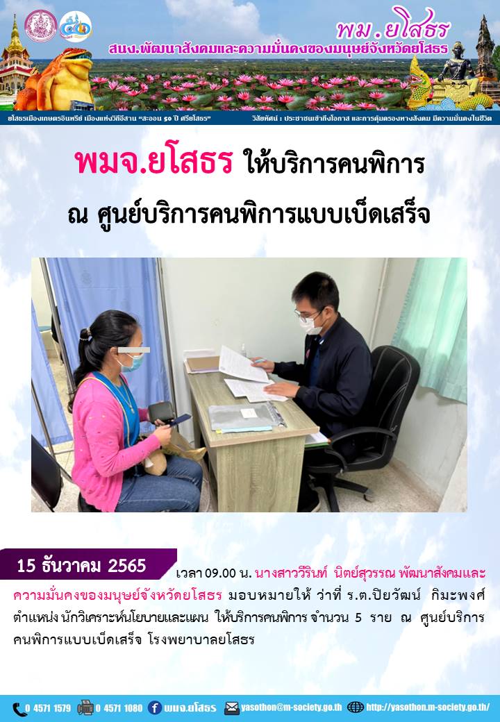 พมจ.ยโสธร ให้บริการคนพิการ ณ ศูนย์บริการคนพิการแบบเบ็ดเสร็จ โรงพยาบาลยโสธร (15 ธันวาคม 2565)