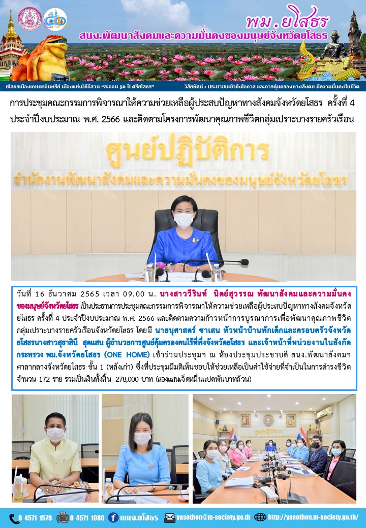 ประชุมคณะกรรมการพิจารณาให้ความช่วยเหลือผู้ประสบปัญหาทางสังคมจังหวัดยโสธร ครั้งที่ 4 ประจำปีงบประมาณ พ.ศ. 2566 (16 ธันวาคม 2565)
