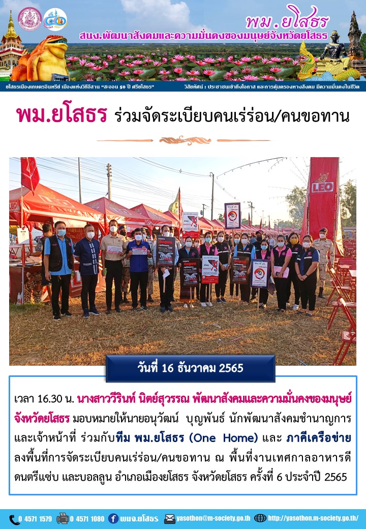 วันที่ 3 ม.ค. 2566 (16:35 น.)วันที่ 16 ธันวาคม 2565 เวลา 16.30 น. นางสาววีรินท์ นิตย์สุวรรณ พัฒนาสังคมและความมั่นคงของมนุษย์จังหวัดยโสธร มอบหมายให้นายอนุวัฒน์ บุญพันธ์ นักพัฒนาสังคมชำนาญการ และเจ้าหน้าที่ ร่วมกับทีม พม.ยโสธร (One Home) และ ภาคีเครือข่ายลงพื้นที่การจัดระเบียบคนเร่ร่อน/คนขอทาน ณ พื้นที่งานเทศกาลอาหารดี ดนตรีแซ่บ และบอลลูน อำเภอเมืองยโสธร จังหวัดยโสธร ครั้งที่ 6 ประจำปี 2565