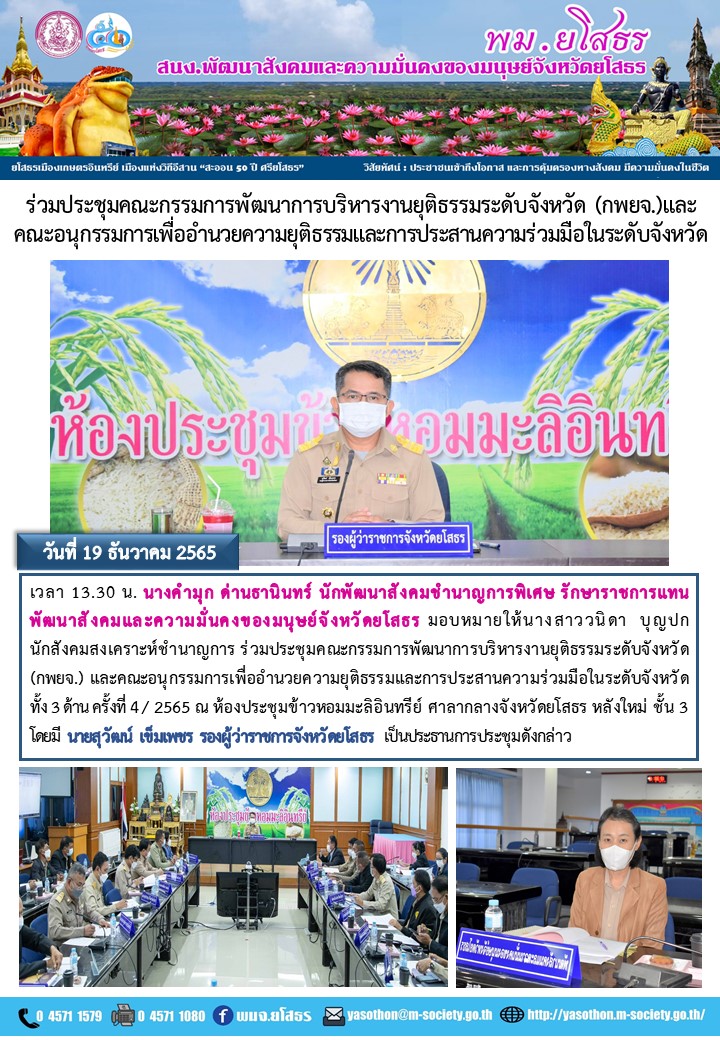 วันที่ 10 ม.ค. 2566 (16:35 น.)วันที่ 19 ธันวาคม 2565 เวลา 13.30 น. นางคำมุก ด่านธานินทร์ นักพัฒนาสังคมชำนาญการพิเศษ รักษาราชการแทน พัฒนาสังคมและความมั่นคงของมนุษย์จังหวัดยโสธร มอบหมายให้นางสาววนิดา บุญปก นักสังคมสงเคราะห์ชำนาญการ ร่วมประชุมคณะกรรมการพัฒนาการบริหารงานยุติธรรมระดับจังหวัด (กพยจ.) และคณะอนุกรรมการเพื่ออำนวยความยุติธรรมและการประสานความร่วมมือในระดับจังหวัด ทั้ง 3 ด้าน ครั้งที่ 4/ 2565 ณ ห้องประชุมข้าวหอมมะลิอินทรีย์ ศาลากลางจังหวัดยโสธร หลังใหม่ ชั้น 3 โดยมี นายสุวัฒน์ เข็มเพชร รองผู้ว่าราชการจังหวัดยโสธร