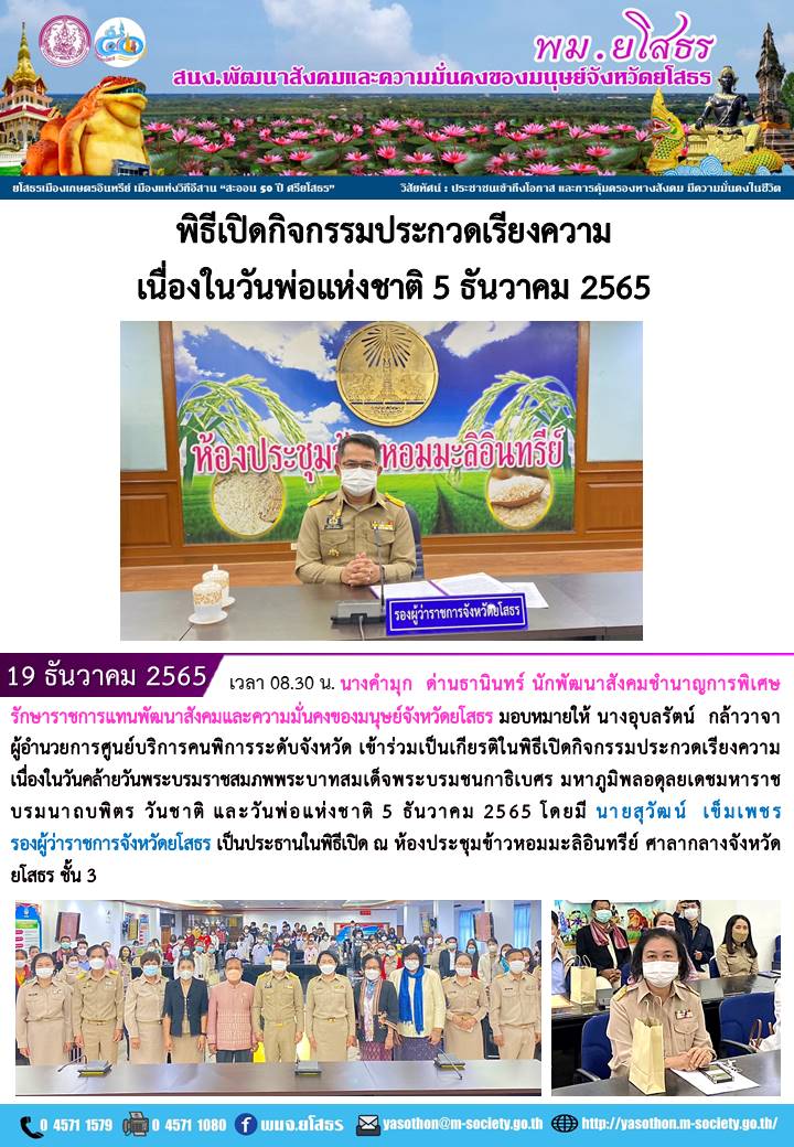 วันที่ 10 ม.ค. 2566 (16:40 น.)วันที่ 19 ธันวาคม 2565 เวลา 08.30 น. นางคำมุก ด่านธานินทร์ นักพัฒนาสังคมชำนาญการพิเศษ รักษาราชการแทนพัฒนาสังคมและความมั่นคงของมนุษย์จังหวัดยโสธร มอบหมายให้ นางอุบลรัตน์ กล้าวาจา ผู้อำนวยการศูนย์บริการคนพิการระดับจังหวัด เข้าร่วมเป็นเกียรติในพิธีเปิดกิจกรรมประกวดเรียงความ เนื่องในวันคล้ายวันพระบรมราชสมภพพระบาทสมเด็จพระบรมชนกาธิเบศร มหาภูมิพลอดุลยเดชมหาราชบรมนาถบพิตร วันชาติ และวันพ่อแห่งชาติ 5 ธันวาคม 2565 โดยมี นายสุวัฒน์ เข็มเพชร รองผู้ว่าราชการจังหวัดยโสธร เป็นประธานในพิธีเปิด ณ ห้องประชุมข้าวหอมมะลิอินทรีย์ ศาลากลางจังหวัดยโสธร ชั้น 3