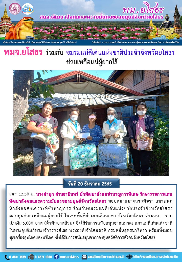 พมจ.ยโสธร มอบทุนช่วยเหลือแม่ผู้ยากไร้ (20 ธํนวาคม 2565)