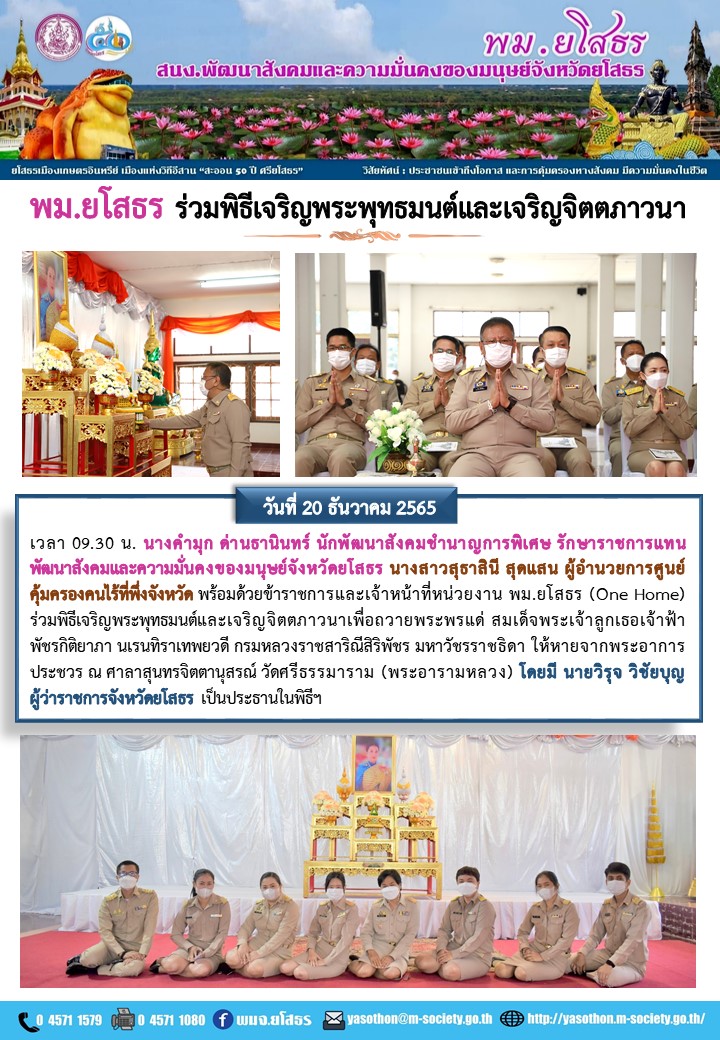 วันที่ 10 ม.ค. 2566 (17:12 น.)วันที่ 20 ธันวาคม 2565 เวลา 09.30 น. นางคำมุก ด่านธานินทร์ นักพัฒนาสังคมชำนาญการพิเศษ รักษาราชการแทน พัฒนาสังคมและความมั่นคงของมนุษย์จังหวัดยโสธร นางสาวสุธาสินี สุดแสน ผู้อำนวยการศูนย์คุ้มครองคนไร้ที่พึ่งจังหวัด พร้อมด้วยข้าราชการและเจ้าหน้าที่หน่วยงาน พม.ยโสธร (One Home) ร่วมพิธีเจริญพระพุทธมนต์และเจริญจิตตภาวนาเพื่อถวายพระพรแค่ สมเด็จพระเจ้าลูกเธอเจ้าฟ้า พัชรกิติยาภา นเรนทิราเทพยวดี กรมหลวงราชสาริณีสิริพัชร มหาวัชรราชธิดา ให้หายจากพระอาการประชวร ณ ศาลาสุนทรจิตตานุสรณ์ วัดศรีธรรมาราม (พระอารามหลวง) โดยมี นายวิรุจ วิชัยบุญ ผู้ว่าราชการจังหวัดยโสธร เป็นประธานในพิธีฯ