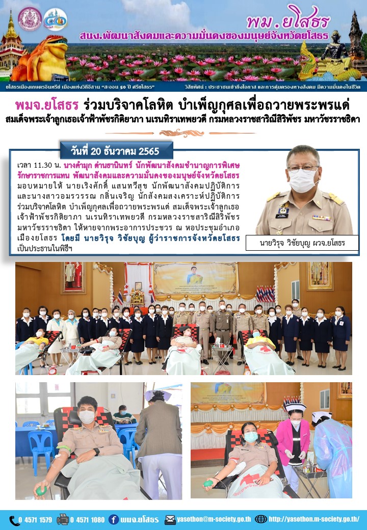 วันที่ 10 ม.ค. 2566 (17:45 น.)วันที่ 20 ธันวาคม 2565 เวลา 11.30 น. นางคำมุก ด่านชานินทร์ นักพัฒนาสังคมชำนาญการพิเศษรักษาราชการแทน พัฒนาสังคมและความมั่นคงของมนุษย์จังหวัดยโสธร มอบหมายให้ นายเริงศักดิ์ แสนทวีสุข นักพัฒนาสังคมปฏิบัติการและนางสาวอมรวรรณ กลิ่นเจริญ นักสังคมสงเคราะห์ปฏิบัติการ ร่วมบริจาคโลหิต บำเพ็ญกุศลเพื่อถวายพระพรแต่ สมเด็จพระเจ้าลูกเธอ เจ้าฟ้าพัชรกิติยาภา นเร่นทิราเทพยวดี กรมหลวงราชสาริณีสิริพัชร มหาวัชรราชธิดา ให้หายจากพระอาการประชวร ณ หอประชุมอำเภอเมืองยโสธร โดยมี นายวิรุจ วิชัยบุญ ผู้ว่าราชการจังหวั่ดยโสธร เป็นประธานในพิธีฯ
