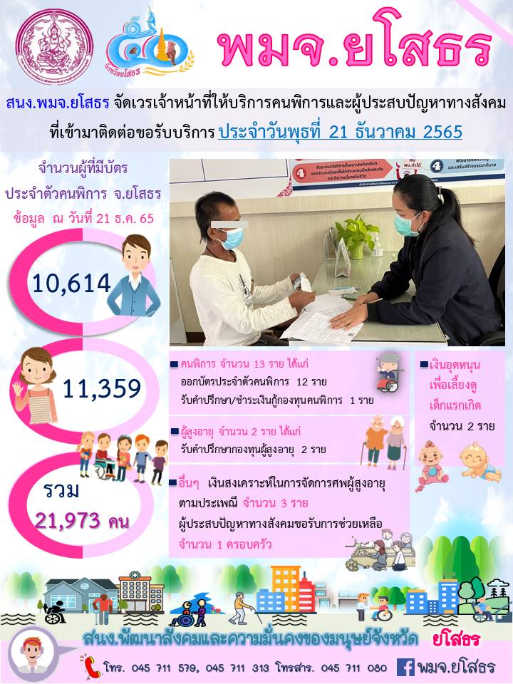 สนง.พมจ.ยโสธร จัดเวรเจ้าหน้าที่ให้บริการคนพิการและผู้ประสบปัญหาทางสังคม ที่เข้ามาติดต่อขอรับบริการ (21 ธันวาคม 2565)