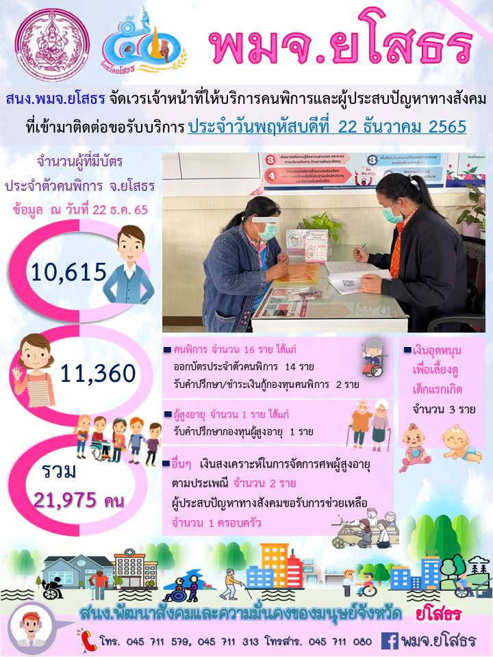 สนง.พมจ.ยโสธร จัดเวรเจ้าหน้าที่ให้บริการคนพิการและผู้ประสบปัญหาทางสังคม ที่เข้ามาติดต่อขอรับบริการ (22 ธันวาคม 2565)