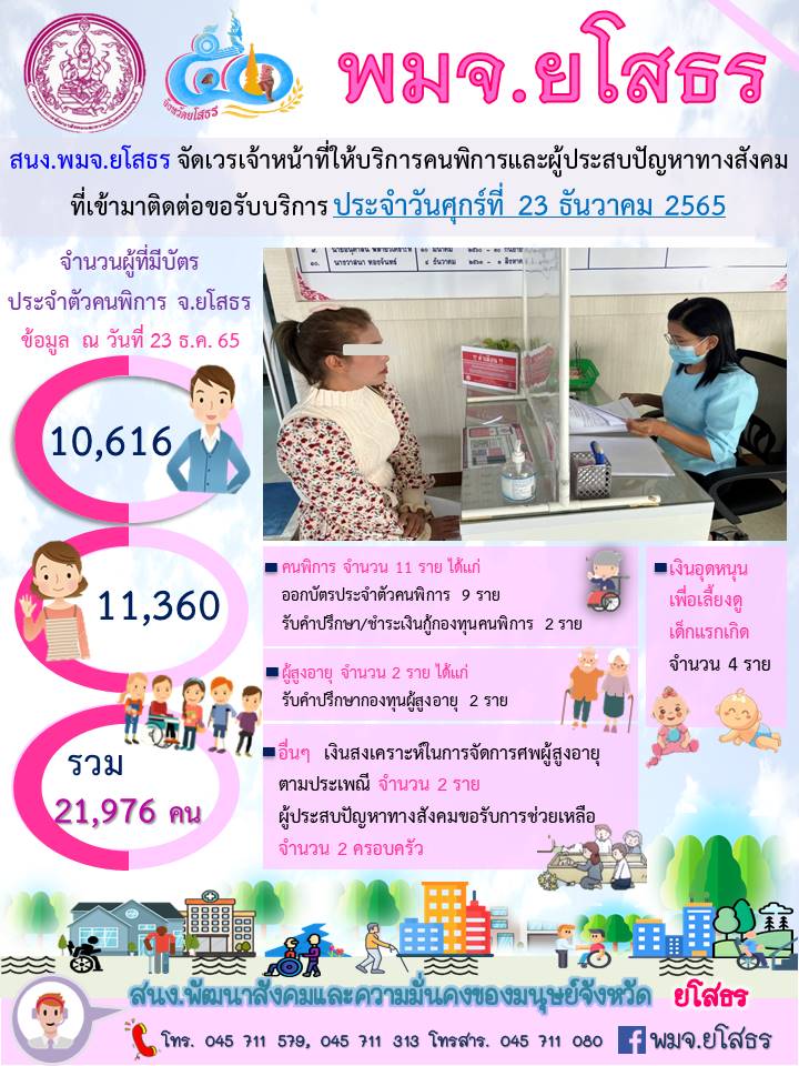 สนง.พมจ.ยโสธร จัดเวรเจ้าหน้าที่ให้บริการคนพิการและผู้ประสบปัญหาทางสังคม ที่เข้ามาติดต่อขอรับบริการ (23 ธันวาคม 2565)