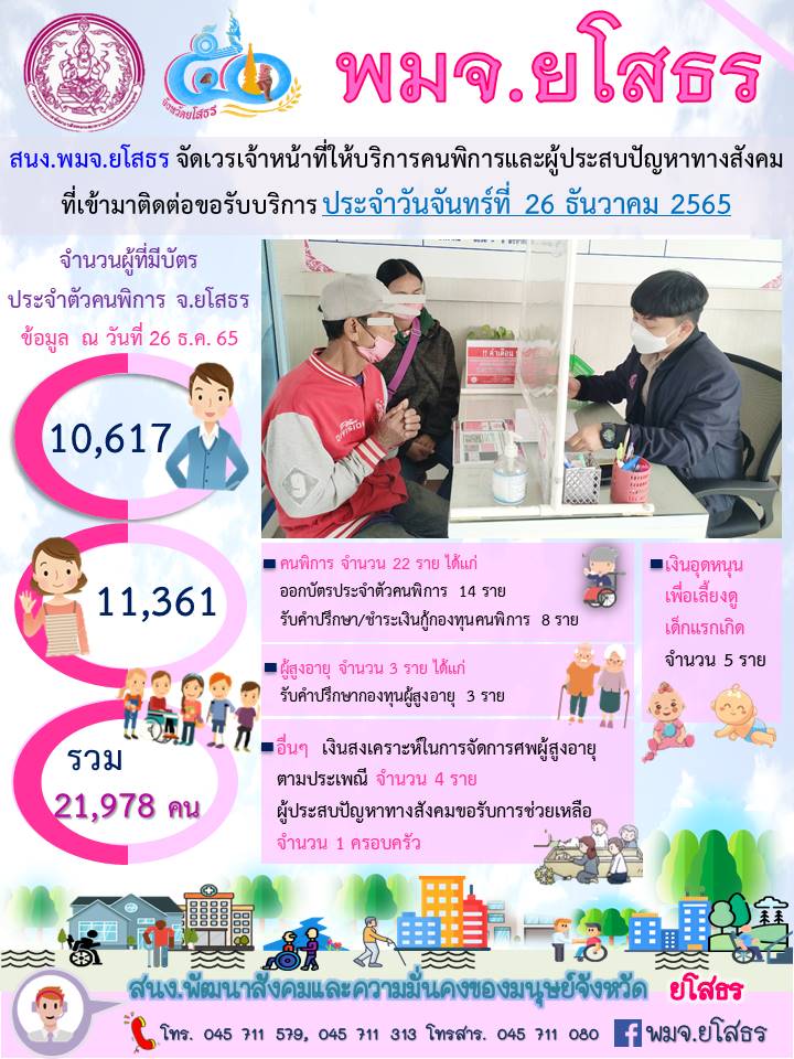 สนง.พมจ.ยโสธร จัดเวรเจ้าหน้าที่ให้บริการคนพิการและผู้ประสบปัญหาทางสังคม ที่เข้ามาติดต่อขอรับบริการ (26 ธันวาคม 2565)