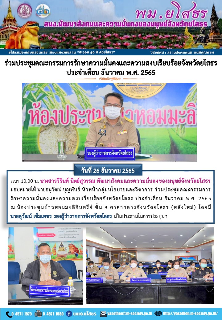 ร่วมประชุมคณะกรรมการ รักษาความมั่นคงและความสงบเรียบร้อยจังหวัดยโสธร (26 ธันวาคม 2565)