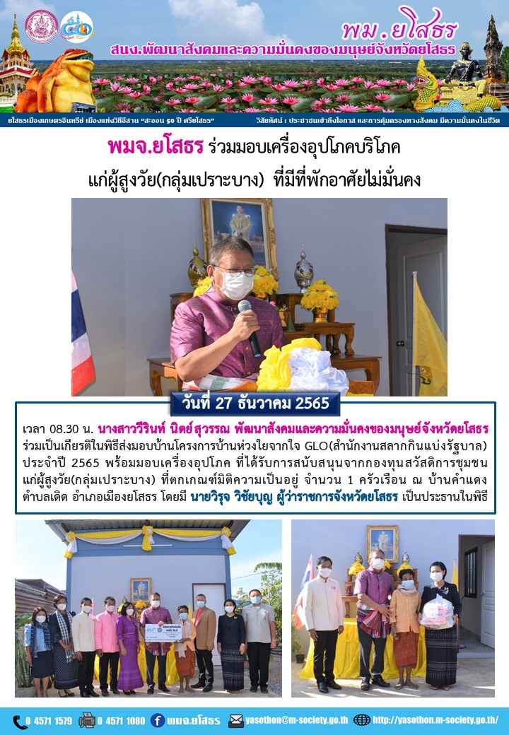 วันที่ 12 ม.ค. 2566 (12:59 น.)วันที่ 27 ธันวาคม 2565 เวลา 08.30 น. นางสาววีรินท์ นิตย์สุวรรณ พัฒนาสังคมและความมั่นคงของมนุษย์จังหวัดยโสธร ร่วมเป็นเกียรติในพิธีส่งมอบบ้านโครงการบ้านห่วงใยจากใจ GLO (สำนักงานสลากกินแบ่งรัฐบาล) ประจำปี 2565 พร้อมมอบเครื่องอุปโภค ที่ได้รับการสนับสนุนจากกองทุนสวัสดิการ์ชุมชนแก่ผู้สูงวัย(กลุ่มเปราะบาง) ที่ตกเกณฑ์มิติความเป็นอยู่ จำนวน 1 ครัวเรือน ณ บ้านคำแดง ตำบลเดิด อำเภอเมืองยโสธร โดยมี นายวิรุจ วิชัยบุญ ผู้ว่าราชการจังหวัดยโสธร เป็นประธานในพิธี